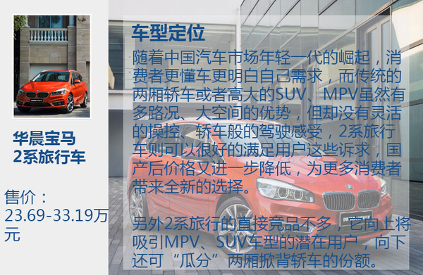 其实2系旅行车不是传统意义的旅行车,是经过宝马重新定义后的,但它同样拥有一般旅行车灵活的操控、轿车的驾驶感受、相对宽敞的空间,还提供了小资的生活态度,所以说它是一款向上可与MPV、SUV竞争的车型,向下又能瓜分两厢紧凑型车的市场份额。