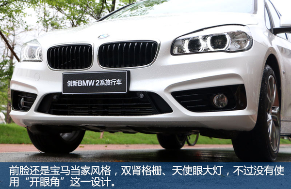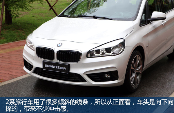 虽然2系旅行车算是宝马家族一个全新定位产品,造型也没有刻意强调多么飘逸的线条,但经典元素遍布全身,虽然较高的车身和两厢设计会很容易让人产生MPV的错觉,但为了避免这样的尴尬,我们看到,各种线条都尽量保持倾斜,比如引擎盖与前挡风玻璃几乎没有形成任何角度,这也就解释了为什么从正面看,2系旅行的车头是向下俯冲的。