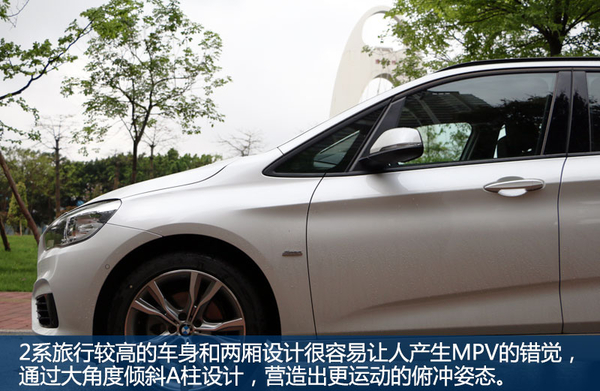 刚才说过,2系旅行为了避免形成MPV的风格,A柱的倾斜很大,而这势必会对车内视野造成影响,所以我们看到,A柱与后视镜间开启了一扇面积还不错的三角窗,对改善视野面积提供了方便。侧身两道腰线,泛起很深的沟壑,形成光影效果。顶棚黑色行李架也彰显运动,轮圈选配了18寸双五辐轮圈。