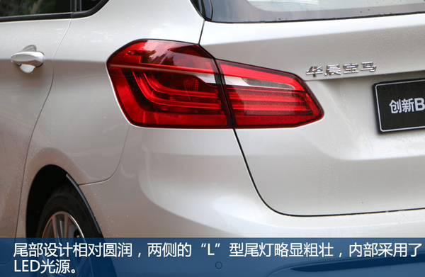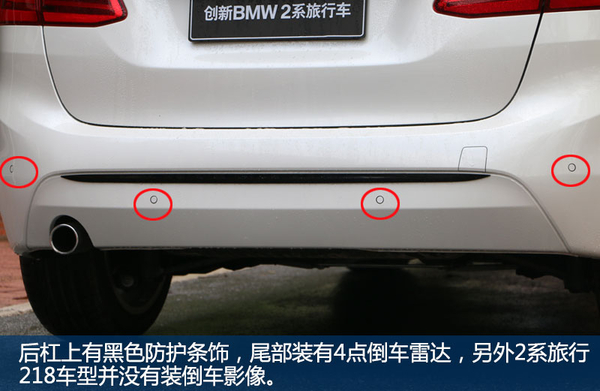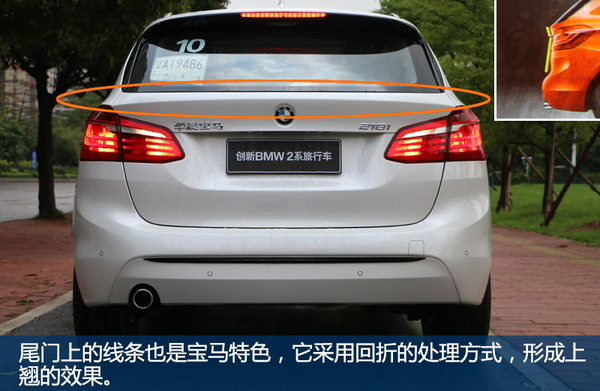 从尾部看,你可能会注意到,2系旅行貌似没有后雨刷器,而作为没有“屁股”的车型,后雨刷基本算是标配。而这正是设计巧妙之处,2系旅行的雨刷被隐藏放置在后扰流板下,在保证功能性的前提下,尾部也更加规整简洁。后杠上方装有4点倒车雷达,而并没有倒车影像。