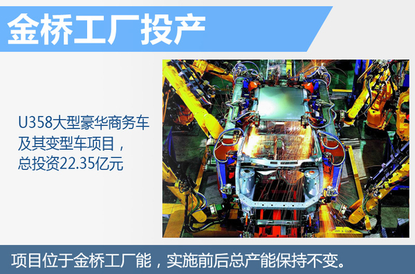 上汽通用汽车有限公司U358大型豪华商务车及其变型车项目,地点位于上汽通用汽车有限公司金桥新厂制造单元中,总投资22.35亿元人民币。项目将对金桥基地北厂冲压车间、新厂总装车间、新厂涂装车间、新厂车身车间内工艺布局及设备进行适应性改造,满足U358大型豪华商务车及其变型车生产的需求,已达到新车型与现有车型共线生产,项目实施前后总产能保持不变。