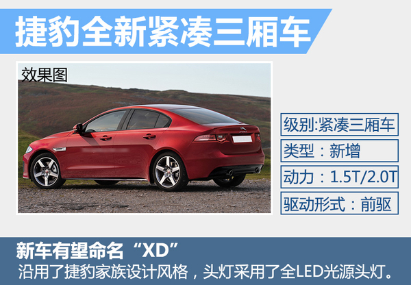 捷豹设计总监伊恩·卡勒姆在接受采访时曾表示:“捷豹将推出一款全新入门级车型,新车有望采用前置前驱平台生产。”捷豹首款紧凑型轿车采用三厢布局,外观方面沿用了捷豹家族式的传统设计风格。根据捷豹品牌的命名体系,捷豹全新紧凑型三厢车有望命名“XD”。