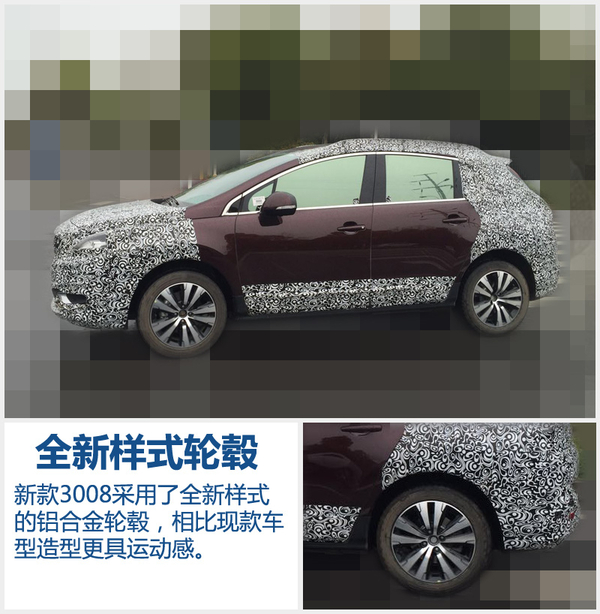 相比前脸部分的改变,新3008车身侧部变化并不大。新车基本延续现款3008圆润的造型风格,外后视镜处于前部三角窗下方,同时车窗周围以镀铬饰条进行装饰。另外,从谍照中可以看出,新3008采用了全新样式的铝合金轮毂,相比现款车型更加动感。