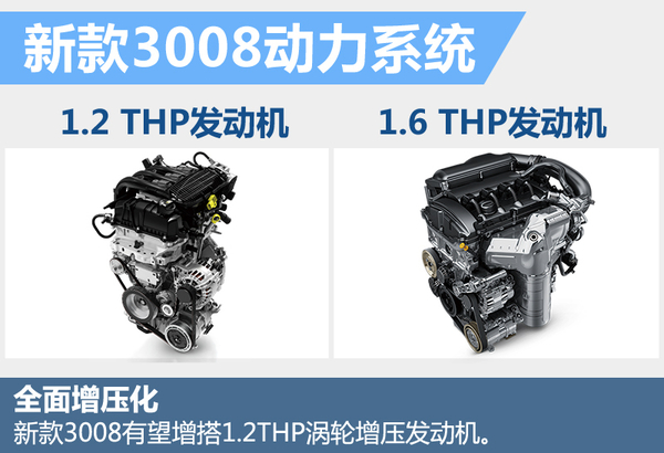 现款东风标致3008拥有2.0L自然吸气和1.6THP涡轮增压两种不同的动力配置。目前,PSA集团的1.2THP发动机已在东风标致旗下的308S、408等车型上进行使用,未来还将普及到更多车型上,新3008即有望以1.2THP取代现款采用的2.0L自然吸气发动机。此外,最大功率123千瓦、峰值扭矩245牛米的1.6THP发动机预计将继续应用于新3008。