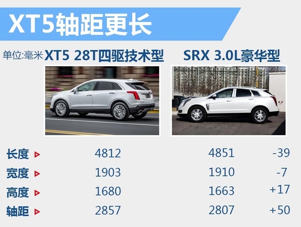 | 车型 | XT5 28T四驱技术型 | SRX 3.0L豪华型 | ||