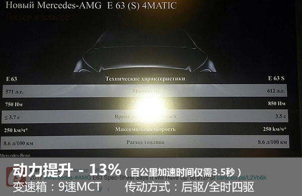 在梅赛德斯-奔驰的产品线之中,E级轿车则是旗下最具代表性的车款之一,作为行政级轿车的风向标之作,E级轿车具备了较佳的组装工艺与动力表现,并且在换代后具有更为明显的综合性能优势。而以全新一代E级轿车为蓝本所设计出的衍生版车型也接踵而至,其中包括E63与旅行版本等。网通社从德国媒体Autobild获悉,梅赛德斯-AMG将以全新一代E63为基础,从而打造出性能更为卓越的E63 S,并且采用旅行车的设计方式。而得益于全新升级的动力总成,新车在动力储备方面将较标准版E63提升13%,最终可在3.5秒的时间内完成百公里加速。