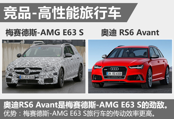在同级别高性能旅行车行列中,奥迪RS6 Avant则是全新一代梅赛德斯-AMG E63 S的竞争对手。而在两车的动力较量中,虽然全新一代梅赛德斯-AMG E63 S所搭载的4.0T发动机在排量方面与RS6 Avant持平,但在变速箱方面则优于RS6 Avant,从而在百公里加速时间与燃油消耗量方面更占优势。(网通社2016年4月14日北京报道)