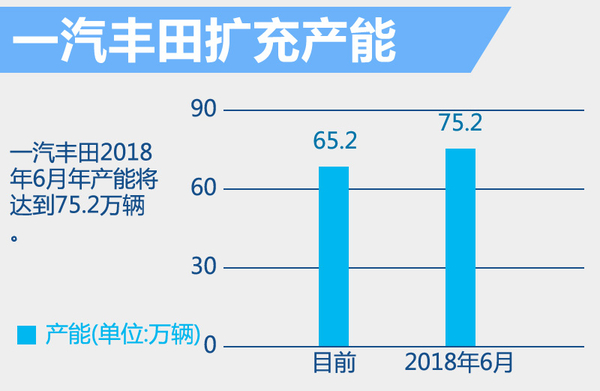 新车的推出需要充足的产能做保障,一汽丰田天津新一生产线已经正式奠基建设,设计年产能为20万辆,一期产能将达到10万辆/年,该生产线并于2018年6月完成,届时一汽丰田年产能将提升之75.2万辆/年。该工厂将作为以TNGA为前提的全新工厂,提高整体生产效率,强化生产体制。建成后,一汽丰田天津新工厂将成为中国最先进的丰田工厂,生产线采用生产车型、生产节拍高度柔性可调的设计,能够满足中国的市场需求投产本土化研发车型。