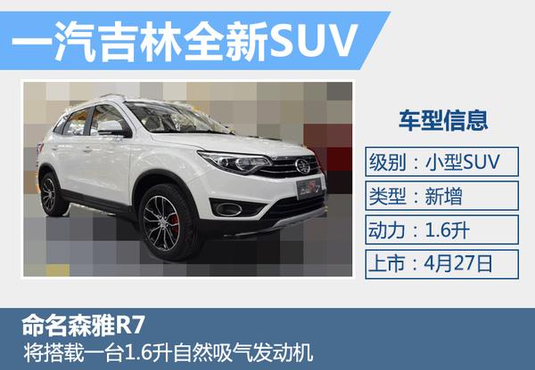 目前一汽吉林旗下已有一款小型SUV森雅S80,随着国内SUV市场销售的火热,以及新车规划的推进,一汽吉林将推出一款森雅系列的全新SUV车型。新车命名为森雅R7,定位于一款小型SUV,其也将成为第二款SUV车型。森雅R7将于4月27日正式上市,预计售价6万元起。