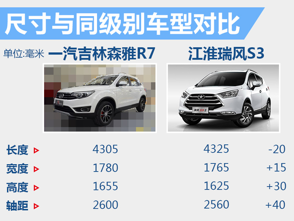 车身尺寸方面,一汽吉林森雅R7车身长宽高分别为4,305*1,780*1,655毫米,轴距为2,600毫米。与同属小型SUV领域的江淮瑞风S3相比,新车在长度方面接近对手,森雅R7较前者短了20毫米,但在宽度、高度方面分别比瑞风S3大了15、30毫米,轴距方面更是大了40毫米。