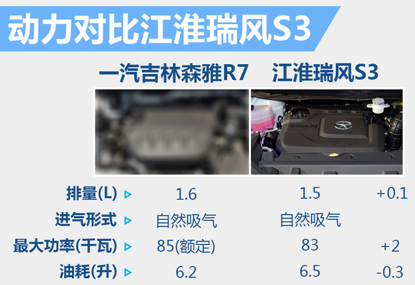 动力方面,一汽吉林森雅R7搭载的是一台1.6自然吸气发动机,采用直列四缸结构,这台发动机额定功率为85千瓦,与之匹配的是一台手动变速箱,综合工况百公里油耗为6.2升。与同级别车型江淮瑞风S3手动变速箱车型相比,森雅R7的发动机排量较瑞风S3大了0.1升,同样功率也大了2千瓦,油耗方面却较瑞风S3降低了百公里0.3升。两车动力基本处于同一水平,一汽吉林森雅R7稍占上风。