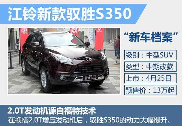 作为江铃自主品牌旗下的重要一环,驭胜系列SUV目前已推出驭胜S350和S350特装版两款车型。按照规划,驭胜系列将在今年进一步完善产品阵容。近日,网通社从江铃汽车:全新驭胜S350和全新入门级SUV驭胜S330将于本月25日开幕的北京车展首发,其中S350将发布售价正式上市,这将是一款搭载“4G”技术的全新产,即:源自福特技术的GTDi发动机、全球研发平台和安全架构、搭载具备人机交互功能的车载互联系统。