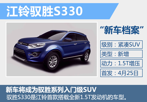 S330是驭胜系列旗下的全新入门级SUV,定位紧凑型市场。其外观造型借鉴了概念车的设计元素,主打的蓝色车身也比较独特。此前有消息称,驭胜S330将率先搭载江铃自主研发的1.5T GTDi直喷涡轮增压发动机,匹配自动变速箱。