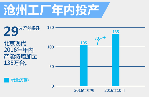 多款新车的推出离不开充足的产能做保障,北京现代目前拥有3座整车工厂,且均位于北京顺义,总年产能为105万辆。需要指出的是,北京现代第四工厂——沧州工厂按计划将于今年10月竣工投产,将为北京现代带来30万辆的年产能提升,总年产能将增加至135万辆,将为完成更高的销售目标奠定基础。需要指出的是,北京现代第五工厂——重庆工厂将于2017年投产,届时北京现代总年产能将增加至165万辆,为北京现代取得更好市场表现打下基础。(网通社2016年4月15日北京报道)