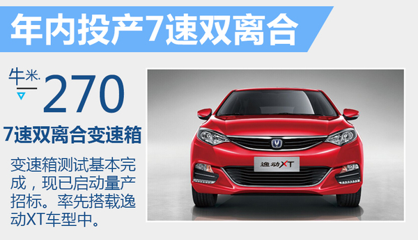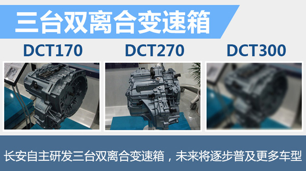 在长安现有的双离合变速箱规划中,将推出三款双离合变速箱,除了代号DCT270的7速双离合变速箱外,长安将率先推出代号为DCT170的5速双离合变速箱,这台变速箱所能承受的最大扭矩为150牛米,今年推出的新款悦翔V7就将搭载这台变速箱。此外,长安还将推出一台能承受更大扭矩的,代号为DCT300的双离合变速箱,而这台变速箱将与下半年推出的2.0T涡轮增压发动机组成长安汽车最强动力系统。