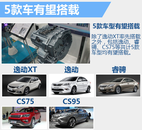 7速双离合变速箱最大承受扭矩270牛米,综合传动效率大于92%。根据这一数据限制,7速双离合变速箱未来将匹配1.5T、1.8T涡轮增压发动机。目前,长安旗下搭载1.5T、1.8T两台台发动机的车型均为中高级产品,除了逸动XT意外,逸动、睿骋、CS75和CS95均有望搭载7速双离合变速箱。