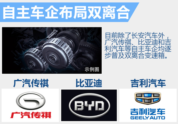 在国内汽车市场中,除了长安汽车外,包括广汽传祺、比亚迪等自主车企也在逐步普及双离合变速箱。其中广汽传祺GA6、GS4和GS5 Super均已搭载双离合变速箱;比亚迪更是从元一直到G6,再到M6,旗下双离合变速箱已从轿车到SUV和MPV实现大面积普及。此外,吉利汽车7速双离合变速箱建设项目已正式通过规划审批。(网通社2016年4月15日北京报道)