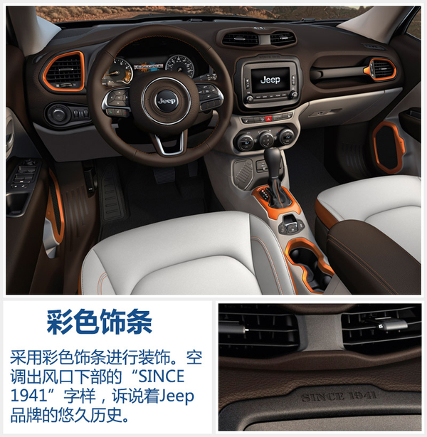 自由侠内饰部分的设计风格小巧精致,采用彩色饰条对空调出风口、杯架等进行装饰,透露着年轻、时尚的气息。空调出风口下部的“SINCE 1941”字样,诉说着Jeep品牌的悠久历史。新车配备了中控大屏、三辐式多功能方向盘,并且拥有一键启动、电子手刹、定速巡航等功能。(网通社2016年4月18日广州报道)