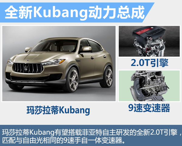 动力方面,玛莎拉蒂Kubang有望搭载菲亚特自主研发的全新2.0T引擎,这款引擎又被称为Global Medium Engine,目前已搭载到阿尔法罗密欧全新中级车型Giulia上。这款2.0升四缸涡轮增压汽油引擎使用菲亚特的Multi-Air可变气门正时技术、缸内直喷技术以及涡轮增压技术。新引擎有高低功率版本,最大功率分别为260千瓦和178千瓦。未来Jeep自由光也有望搭载这台引擎。传动方面,全新Kubang有望使用与自由光相同的9速手自一体变速器。
