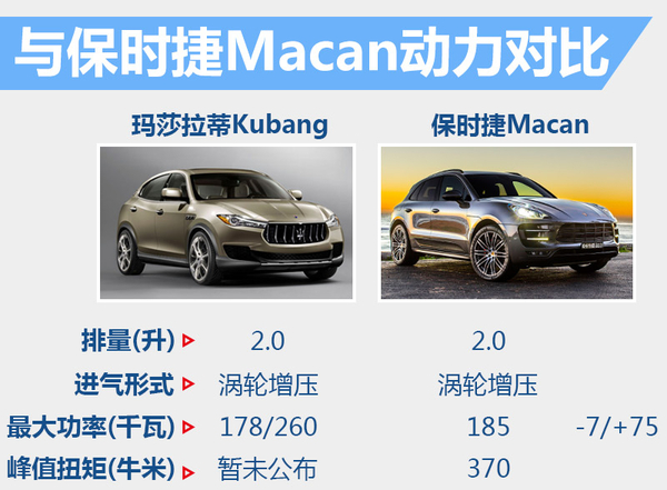 在同级别细分市场中,保时捷Macan是玛莎拉蒂Kubang强有力的竞争对手,并且同样有2.0升排量版本车型提供。在动力方面,玛莎拉蒂的2.0T引擎提供高低功率两种版本,其中高功率版的260千瓦最大功率较Macan搭载的2.0T引擎高出75千瓦;而低功率版引擎的最大功率也仅较Macan搭载的2.0T引擎低7千瓦。