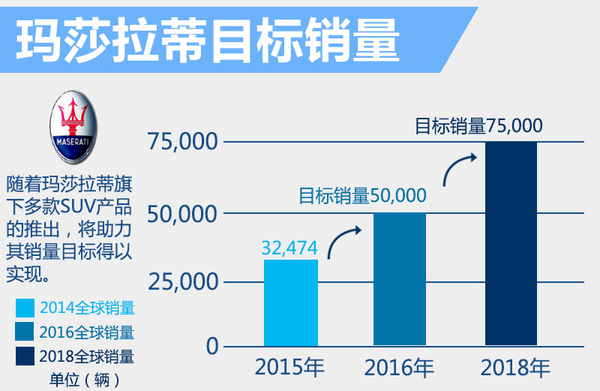 玛莎拉蒂全球销量从2010年起持续攀升,2014年更是同比增长137%,达到36,448辆。但2015年玛莎拉蒂全球销量同比下降近11%,为32,474辆,结束了五年来的持续增长,并远未达到其规划的5万辆目标销量。今年首发的大SUV Levante被玛莎拉蒂视为提升销量的关键产品,因此将2016年全球销量目标重新设定为50,000辆。而2018年玛莎拉蒂将目标销量设定为75,000辆,随着玛莎拉蒂旗下多款SUV新车的推出,将助力其销量目标得以实现。(网通社2016年4月18日北京报道)