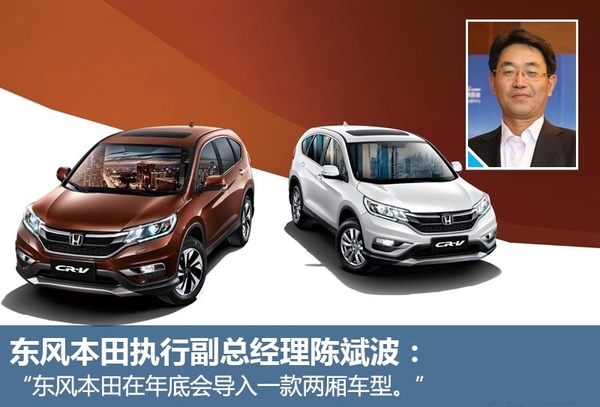 2015年,东风本田全凭借着多款新车的投放,实现了年累计销量40万辆的成绩。2016年东风本田将销量目标定为45万,将推出全新车型助力品牌实现销量目标。东风本田执行副总经理陈斌波在与网通社沟通时表时:“东风本田在年底会导入一款两厢车型。”在东风本田增压发动机阵容中,除已经搭载在全新思域上的1.5T发动机以外,旗下还有更小排量的1.0T发动机储备,新车有望搭载本田全新的1.0T发动机,凭借着强劲的动力赢得更多的市场份额。