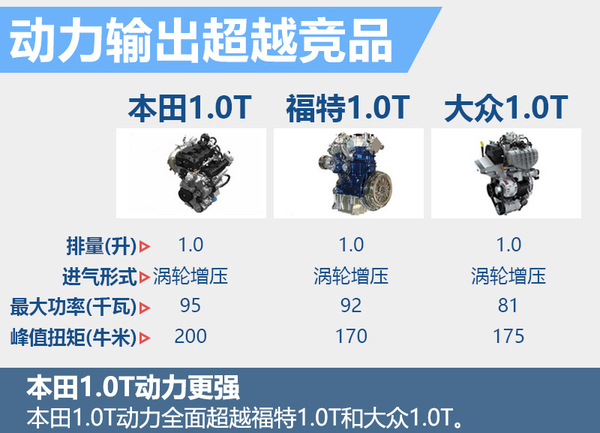 1.0T涡轮增压发动机是本田此前在中国媒体大会发布的三款增压发动机之一,当下小排量增压发动机已经成为一种趋势,此前福特已推出1.0T增压发动机,而大众集团旗下车型也已成功搭载1.0T发动机。相比之下,本田1.0T增压发动机实现了最大功率与峰值扭矩方面的全面超越,更具竞争实力。东风本田全新两厢车搭载1.0T后,将为消费者提供更多选择。