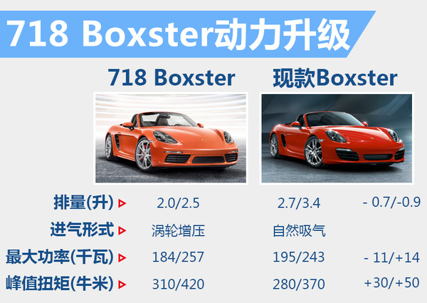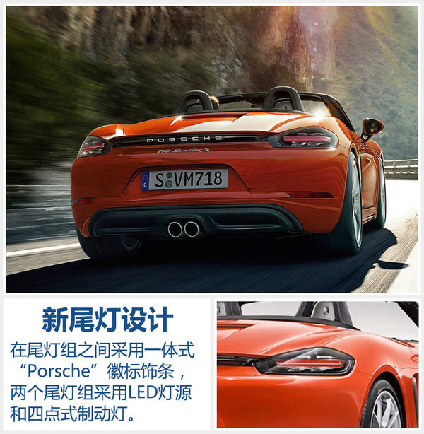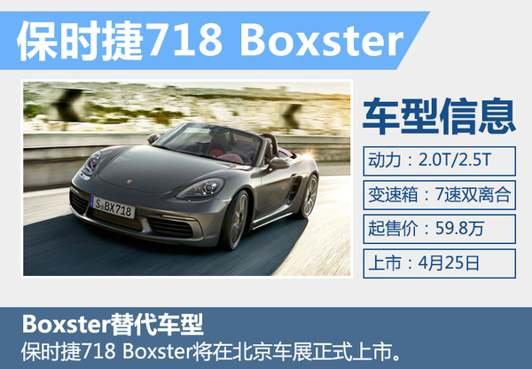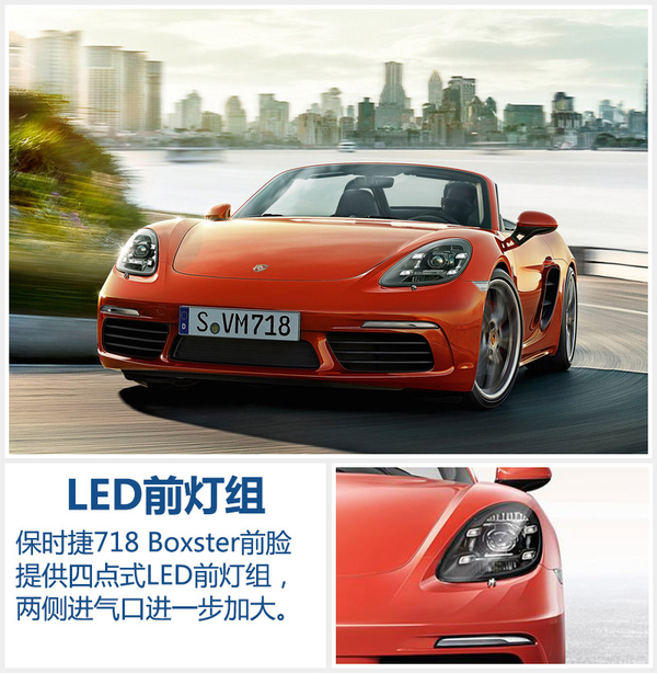 即将在华推出的保时捷718 Boxster将作为现款Boxster替代车型,拥有全新的造型设计、全新调校的底盘和发动机。除保留行李厢盖、挡风玻璃以及敞篷车型的设计,其余造型均进行大刀阔斧的改进。新车外观采用更大的进气口,一体式LED日间行车灯和双氙气大灯,同时还提供四点式LED大灯和LED日间行车灯的选择。