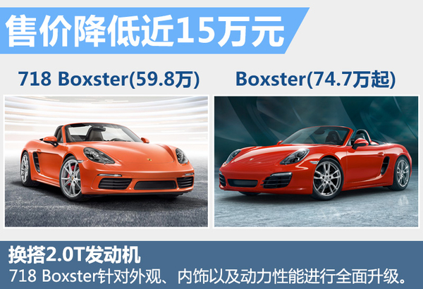 保时捷于日内瓦车展上复活经典的718车系,并将Boxster并入其中,正式发布了全新入门级敞篷跑车718 Boxster。这款新车在欧洲市场推出后,即将导入保时捷全球最大的单一市场中国。网通社为此与保时捷中国公关传媒总监唐凤靓女士进行沟通,唐凤靓女士向网通社表示:“718 Boxster是亚洲首次亮相另外会有一款全球首亮相的车型。”网通社从保时捷授权经销商了解到开始接受718 Boxster预定,入门车型预定价格59.8万,相比目前保时捷中国官方网站在售的Boxster“入门车型” 74.7万(Boxster Style Edition)的价格降低了近15万元。
