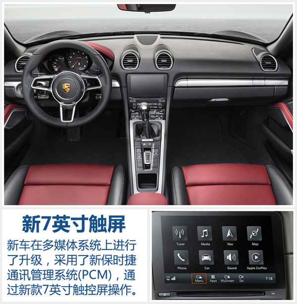 在内饰方面,718 Boxster的中控台整体造型延续现款风格,新车的空调出风口造型有所调整,同时采用全新造型的三辐式真皮方向盘。除此之外,新车在多媒体系统上进行了升级,采用了新保时捷通讯管理系统(PCM),通过新款7英寸多点触控屏进行操作,实现蓝牙免提、音乐播放等功能。