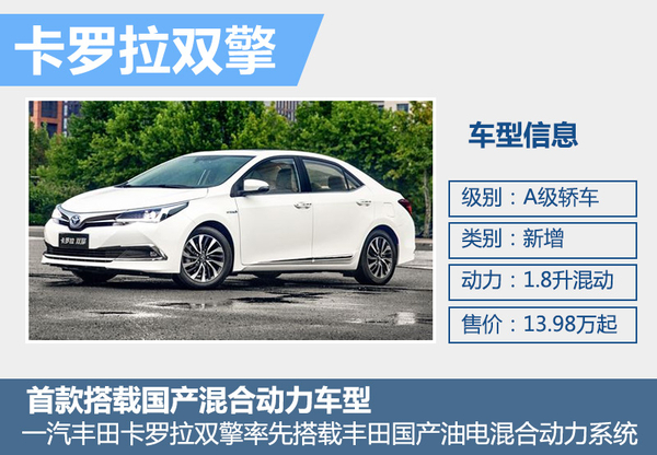 一汽丰田卡罗拉双擎于2015年10月28日正式上市,新车共推出4款车型,售价区间为13.98-17.58万元,售价与传统动力版车型基本一致。卡罗拉双擎的低价入市,也表明了一汽丰田发展新能源领域的决心。这款车搭载由1.8L汽油发动机和电动机组成的油电混合动力系统,其中1.8L自然吸气发动机最大功率为73kW,最大扭矩为142Nm,电动机最大功率为53kW,最大扭矩则为207Nm;传动系统匹配CVT无级变速器,可提供电动模式、节能模式和动力强劲的加速模式三种驱动方式。