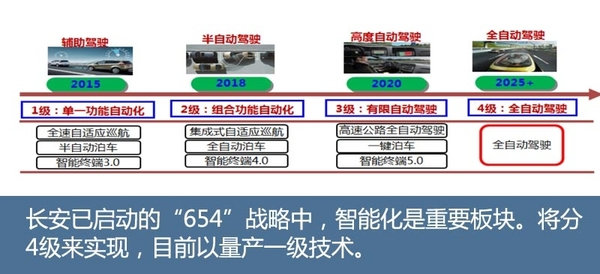 在智能化汽车方面,长安已制定了面向2025的智能汽车技术发展规划,即“654”战略,要搭建6大平台,掌握5大核心应用技术,分4个阶段实现智能化技术的产业化。