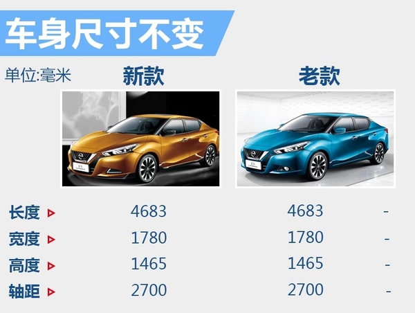 新款蓝鸟1.6L 智炫版CVT版与老款蓝鸟1.6L 智酷版CVT相比,尺寸不变