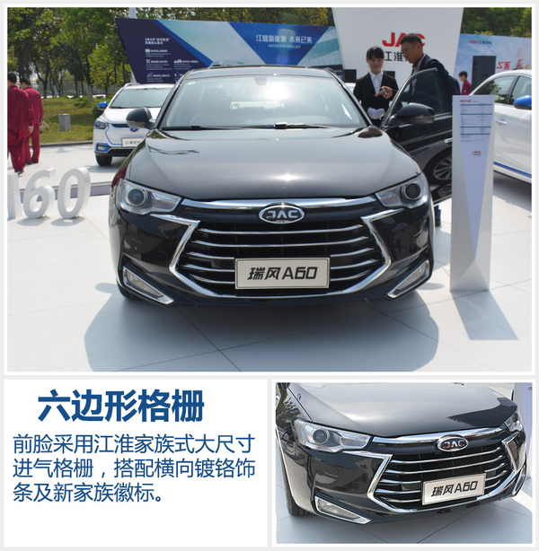 瑞风A60整体造型设计稳重而气势,细节处轮廓与知名行政座驾奥迪A6有相似之处。前脸采用六边形大尺寸进气格栅,采用横向镀铬饰条装饰,上沿采用开口式造型搭配新“JAC”家族徽标,并与两侧头灯组连通,具备不错的整体感,在维持整车稳重造型的同时增添了一份凌厉。