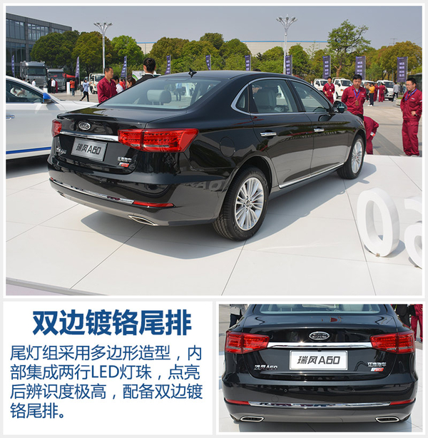 尾部整体造型注重横向拉伸的视觉效果,尾箱的大尺寸横向镀铬饰条及下包围的饰条均提升了这一效果。尾灯组采用多边形造型,内部采用了两行LED灯珠作为光源,点亮后视觉效果出色且具备极高的辨识度。新车配备了双边单出式镀铬尾排,进一步提升了其作为行政车款定位的档次感。瑞风A60长宽高尺寸为5005*1890*1503毫米,轴距达到2915毫米,为车内提供出色的驾乘空间。