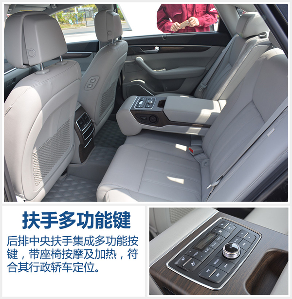 新车主要将面向注重公商务出行的用户,后排中央扶手集成了多功能按键,可对音响、空调进行控制,并可独立控制座椅角度及按摩、加热等功能,大幅提升后排乘客的乘坐舒适性。此外后排还提供独立空调出风口及电源接口,符合该级别车型该有的舒适性配置。