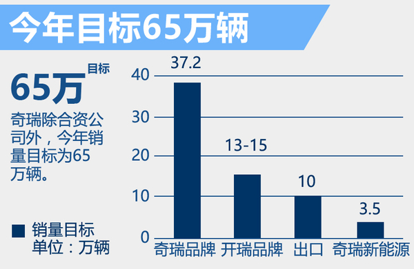 按照奇瑞汽车规划,今年将冲击65万辆左右的销量目标,除两大合资公司销量外划分为四部分。商用车今年销量目标预计在13-15万辆,奇瑞国内品牌销量预计在37.2万辆,海外出口做到10万辆,奇瑞新能源销量目标为3.5万辆。
