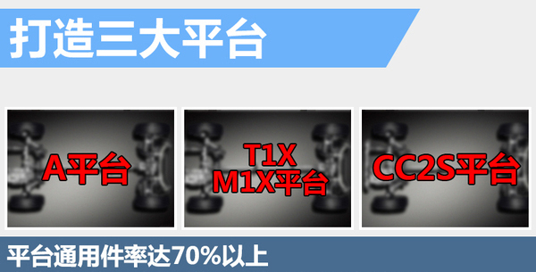 产品的密集投放离不开研发技术的升级。按照奇瑞发布的新五年规划,将逐步形成全新三大产品平台。包括A平台(注重产品的性价比,注重燃油经济性)、T1X/M1X平台(更均衡的性能,更好的延展性)、CC2S平台(更出色的底盘和操控性能),各平台的通用件率将达到70%以上,奇瑞未来5年推出的全新车型将基于这三大平台打造而来。