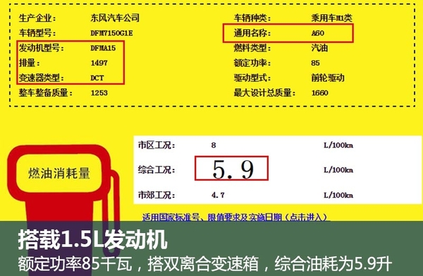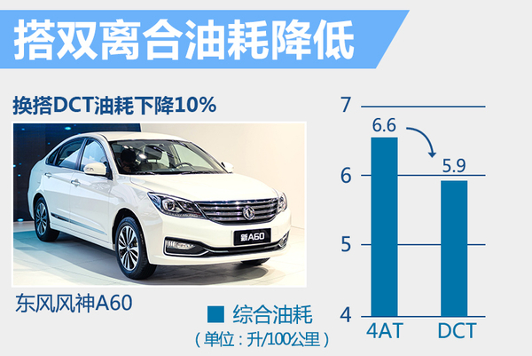 东风风神旗下的紧凑级轿车A60,目前提供1.5升、1.6升以及1.4T三种不同动力的车型。其中,两款自然吸气车型除手动挡外还匹配4速自动变速箱。网通社此前从国家工信部获悉,东风风神A60的1.5升自然吸气车型将搭载全新的双离合自动变速箱,每百公里综合油耗为5.9升。A60将成为东风风神所有产品中,率先搭载双离合变速箱的车型。采用4速自动变速箱的A60 1.5L版本每百公里综合油耗为6.6升,相比而言,新车的油耗大幅降低10%。(网通社2016年4月20日北京报道)