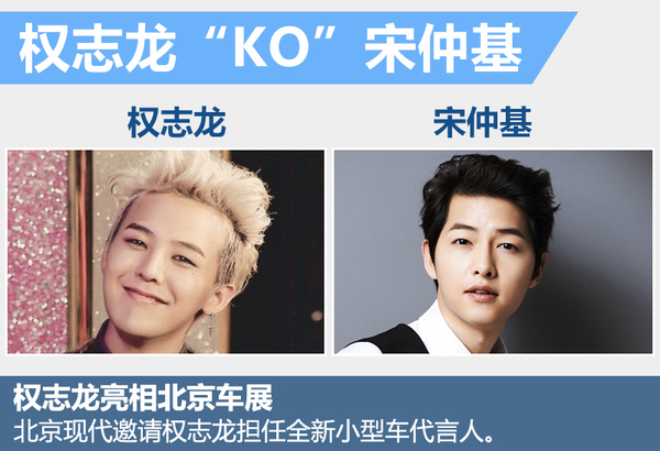 “明星代言新车”是一种传统的宣传方式,在两年前凭借热播剧《来自星星的你》走红的金秀贤成为北京现代ix25的代言人,并来到北京车展,当时人气爆棚的场景成为最大话题。在两年后,新一届北京车展即将在4月25日开幕,网通社从北京现代内部人士了解到:北京现代邀请韩国当红组合Bigbang队长——权志龙,为北京现代全新小型车代言,其将与全新小型车一同亮相北京车展。在此之前,北京现代曾考虑“全民老公”宋仲基,但权志龙凭借在中国的超高人气KO前者,想必此次北京车展关注度又将再创新高。