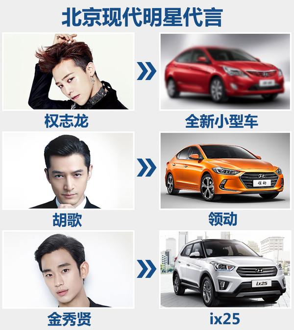 北京现代已经邀请了多位明星为旗下新车型代言,《琅琊榜》男主角扮演者胡歌为A级车领动代言,领动整体造型与现款朗动相比更显时尚、阳光、运动,这一点与胡歌给人的印象一致,这可能也是北京现代邀请胡歌为全新A级轿车领动代言的原因之一。此前北京现代邀请热播电视剧《来自星星的你》中都敏俊的扮演者金秀贤来为小型SUV ix25代言,ix25简洁大方、追求时尚和品质生活的特质正好与都敏俊的人物性格及身份相匹配。北京现代邀请明星代言新车,也是希望借明星效应为新车做更好的宣传。