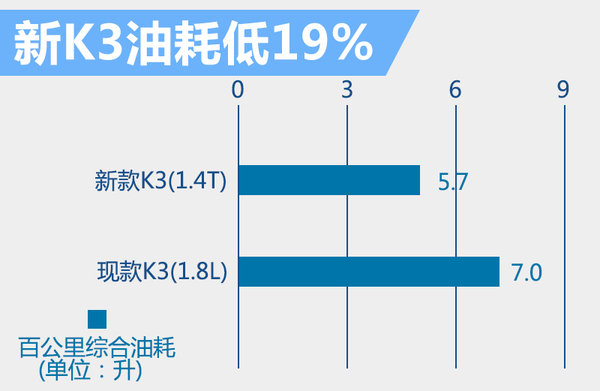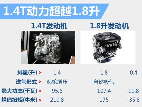 东风悦达起亚现款K3所搭载的1.6升和1.8升自然吸气发动机中,1.8升发动机最大功率为107.4千瓦,峰值扭矩为175牛米。根据工信部公布的消息,新K3搭载的1.4T涡轮增压发动机最大功率为95.6千瓦,峰值扭矩为210.8牛米。通过对比可知,1.4T发动机虽然在最大功率上不及1.8升,但在峰值扭矩方面大幅超越1.8升发动机,动力实现提升。