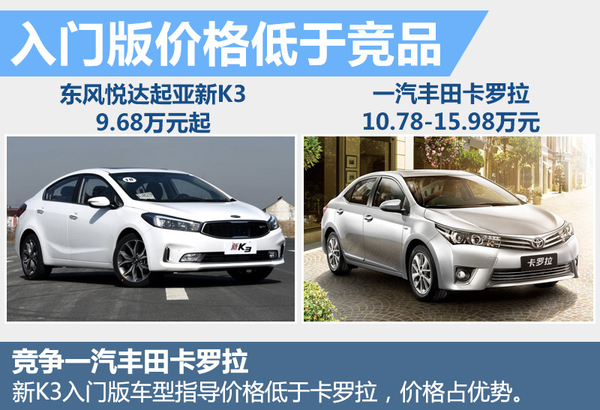 目前国内市场A级轿车市场竞争十分激烈,东风悦达起亚新K3上市后将会与一汽丰田卡罗拉等同级别车型展开竞争。从价格来看,新款K3指导价格为9.68万元起,卡罗拉官方指导价格为10.78-15.98万元,相比之下,新款K3入门版车型比卡罗拉便宜1.1万元,价格更有优势。