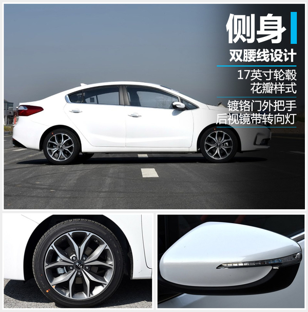 侧面来看,新款K3延续了现款车型的设计。采用双腰线设计,上方腰线弧度不大,下方线条中部给人“弯曲”式的视觉感受,看起来十分流畅。配备17英寸花瓣式轮毂,规格为215/45 R17,提升运动感。后视镜带有条带状的转向指示灯,这与现款车型相比没有变化。