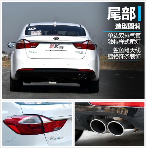 东风悦达起亚在尾部造型方面也进行了改动,尾灯与现款车型保持一致,两侧尾灯由一条镀铬饰条相连;排气管采用单边双出设计,镶嵌于后保险杠之中,增加了动态感。新款K3从尾部看起来造型圆润,给人一种沉稳踏实的感觉。