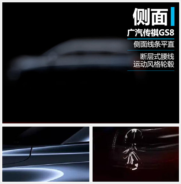 广汽传祺官方发布的预告图只有一个非常模糊的侧面轮廓,依然以平的直线条为主。细节方面,侧面腰线使用了断层式的设计,并且与大灯灯组向上舒展部分相连。新车配备了全新样式的大尺寸抛光轮毂,视觉上更显运动、霸气。