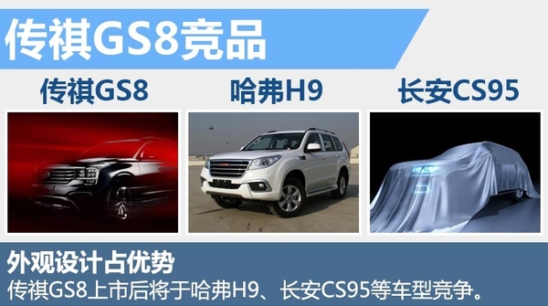传祺GS8是广汽传祺发力高端市场的第二款产品,定位中大型SUV。动力方面,GS8预计将搭载与GA8相同的2.0升直列四缸涡轮增压发动机。这台发动机由广汽传祺自主研发,最大功率为145千瓦,最大扭矩为300牛米。新车还将提供四驱版本车型。目前在中大型SUV这一细分市场中,自主品牌并没有太多的布局,仅有哈弗H9等产品,长安CS95也将于年内上市,GS8上市后将与上述车型展开竞争。
