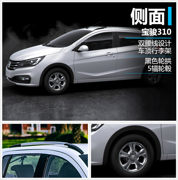 在车身侧面设计中,宝骏310的设计更为大胆,双腰线贯穿车身,下腰线的造型具有很强的俯冲感。从图片可以看到,宝骏310在外后视镜上集成了转向灯,配备车顶行李架,黑色轮拱与全新样式的5辐轮毂搭配,时尚感骤增。