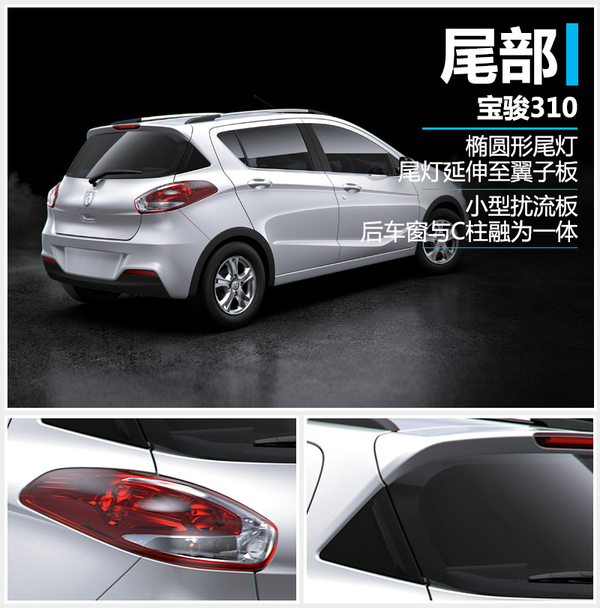 宝骏310车尾部分最具特点的当属C柱的设计,经过特殊处理的C柱,与后车窗融为一体,给人以C柱向后倾斜的视觉感受。尾灯灯组经过全新设计,采用椭圆形的设计。尾灯向翼子板处延伸的设计更显大气,且内部富有层次感。新车尾部上方还加入小型扰流板,并配备了高位刹车灯。