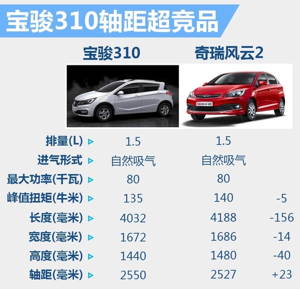 在自主品牌小型车这一市场中,已有奇瑞风云2、北汽绅宝D20等产品。宝骏310上市后将与上述车型展开竞争。三款车型均搭载了1.5升自然吸气发动机。宝骏310所搭载的1.5升发动机在动力上略低于奇瑞风云2。宝骏310车身尺寸为4,032*1,672*1,440毫米,轴距为2,550毫米,与奇瑞风云2相比,轴距占优势。
